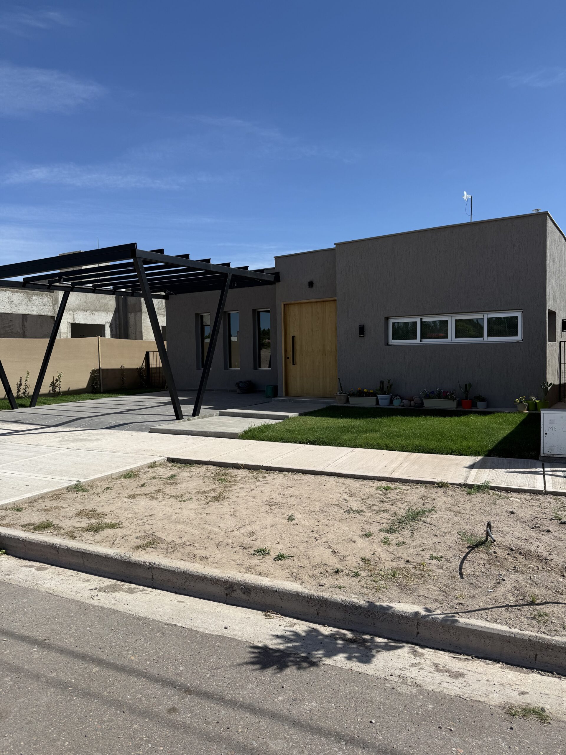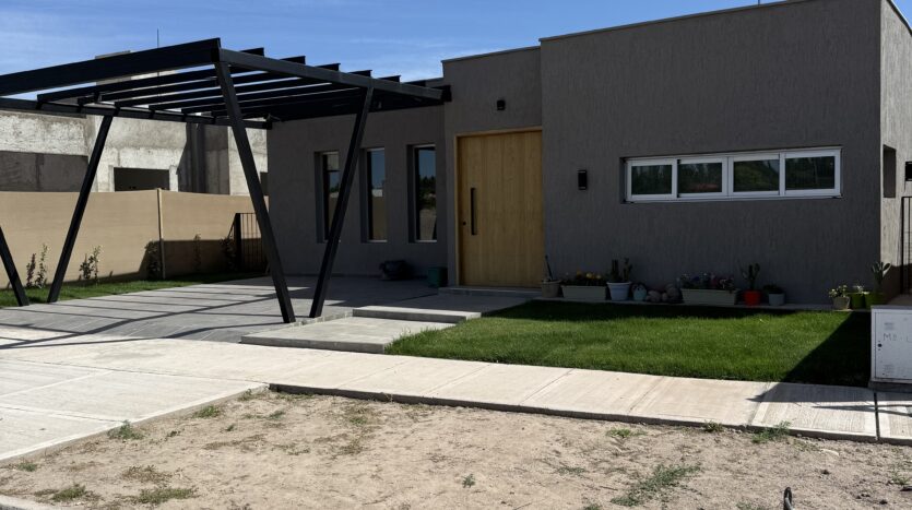 Desarrollamos una construcción completamente abastecida en paneles EPS (paneleria de tergopol) con hormigón proyectado tanto para paredes como para Losa de techos , optamos por terminar en todo en interior con yeso tanto como paredes y techo suspendido, aplicando pisos porcelanatto de primera calidad en pisos , aclimatando el espacio con sistema de radiadores por agua y por split de aire acondicionado. Cuenta con carpinterías de aluminio anonizado de alta prestación . Aprovechamos la orientación solar como prioridad brindando una casa sumamente luminosa . Desarrolla un amplio y cómodo estar comedor con conexión directa a una cocina separada para priorizar la separación del espacio de cocina del espacio social, dando la posibilidad de no compartir visuales ni aromas provenientes del lugar, cocina con amplia cantidad de muebles con un desarrollo en “U” dando un espacio optimo para amantes de la cocina en tanto a su funcionalidad anexado a un patio de luz interno ; dejando pasillos anchos, dormitorios de amplia espacialidad. Utilizamos el sistema de antebaño para el baño principal del hogar permitiendo de esta manera un doble uso paralelo tanto como para usuario de la habitación secundaria de la casa como huéspedes. El dormitorio principal cuanta con ventanal el “L” dejando una cierta privacidad hacia la galería en caso de tener reuniones sociales y dejando la salida a la parte mas privada del jardín. Dejamos una galería muy amplia con orientación nor-oeste y una cochera doble pergolada en ingreso.